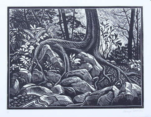 A linocut is a type of relief print created by carving into a piece of linoleum using sharp tools like knives and gouges. The remaining areas are inked, a piece of paper is placed on top and pressure is applied to the paper. It is possible to handprint using a baren or spoon and some of my pieces are handprinted but most of them are printed using a press because of their large size.